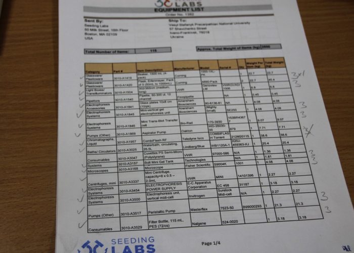 Багаж з приладами прибув пізно ввечері 15 березня. Кафедра отримала метаболічні клітки для лабораторних мишей, інкубатори для культур клітин, холодильник для зберігання біологічних проб (охолодження до -80 градусів), спектрофотометри, а також інші прилади, важливі для прогресу в наукових дослідженнях. На сьогодні працівники кафедри біохімії та біотехнології Прикарпатського національного університету імені Василя Стефаника знаходяться на високих позиціях в рейтингу науковців України і мають міжнародне визнання. Нове обладнання від SeedingLabs дозволить проводити ще ґрунтовніші дослідження з вагомішими результатами і забезпечить ще більше зростання рейтингу кафедри та університет