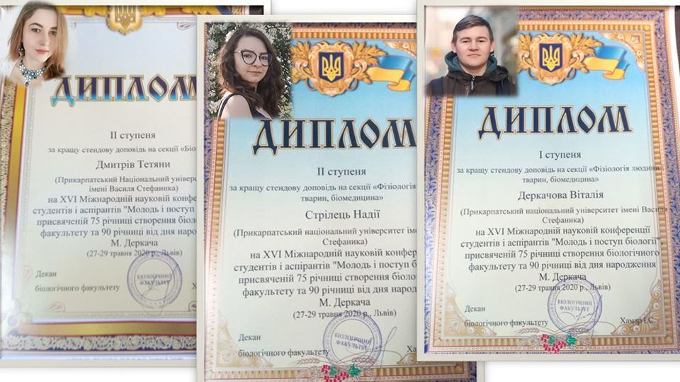 Студенти-третьокурсники Віталій Деркачов, Надія Стрілець та Тетяна Дмитрів дистанційно взяли участь у XVI Міжнародній науковій конференції студентів та аспірантів “Молодь і поступ біології”, яка була організована Львівським національним університетом ім. Івана Франка. Віталій та Надія доповідали у секції “Біофізика.Фізіологія людини та тварин, біомедицина”, а Тетяна – у секції “Біохімія”.