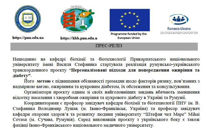 Наш новий, спільний з румунськими колегами, амбітний проект з чітко практичним спрямуванням – діагностика ризику ожиріння та цукрового діабету у жителів Івано-Франківської області та широке інформування про важливість та шляхи попередження захворювань, пов’язаних з харчуванням.