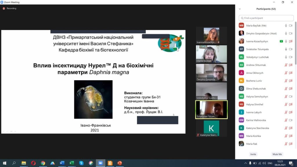 Сьогодні своїми науковими здобутками ділилися наші студенти. Магістрантка Заячківська Аліна доповіла про вплив 2,4-динітрофенолу, відомого роз’єднувача мітохондріального дихання, на стійкість плодових мух до різних стресів. Магістрантка Струтинська Тетяна розказала про субстратні особливості ферментів енергетичного обміну у довго-і короткоживучих плодових мух. Магістрантка Матвеєва Христина представила результати по впливу альфа-кетоглютарату на гематологічні та імунологічні показники молодих мишей на фоні висококалорійної їжі. Студент четвертого курсу Роман Карпенко доповів про перші етапи розробки мобільного додатку для внесення лабораторних даних. Цикл доповідей студентів третього курсу (Рибчук Леся, Козачишин Іванна, Старчевська Катерина, Кліщ Світлана) був присвячений впливу пестицидів на не-таргетні організми (плодову мушку та дафнію). Третьокурсник Цюмпала Святослав зробив теоретичний огляд про причини нейрозапалення і потенційну роль сульфарафану (компонента броколі) як нейропротектору. Перші свої виступити зробили студенти-другокурсники – Харук Святослав про вплив голодування на личинковій стадії протягом різного часу на харчову поведінку та плодючість дорослих мух, і Маліновська Каріна про вплив типу “сніданку” на харчову поведінку і тривалість життя плодових мух.