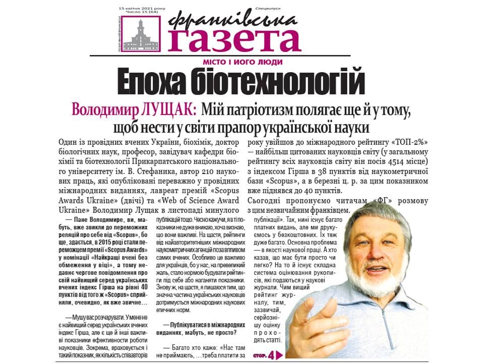 Один із провідних вчених України, біохімік, доктор біологічних наук, професор, завідувач кафедри біохімії та біотехнології Прикарпатського національного університету ім. В. Стефаника, автор 210 наукових праць, які опубліковані переважно у провідних міжнародних виданнях, лавреат премій «Scopus Awards Ukraine» (двічі) та «Web of Science Award Ukraine» Володимир Лущак в листопаді минулого року увійшов до міжнародного рейтингу «ТОП-2%» — найбільш цитованих науковців світу (у загальному рейтингу всіх науковців світу він посів 4514 місце) з індексом Гірша в 38 пунктів від наукометричної бази «Scopus», а в березні ц. р. за цим показником вже піднявся до 40 пунктів.