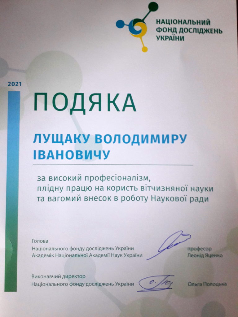 Професор Володимир Лущак отримав подяку від Національного фонду досліджень України.