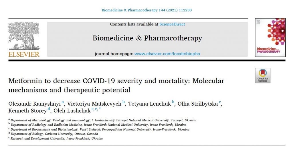 Наші науковці у співпраці з колегами з медичних університетів Тернополя та Івано-Франківська цікава оглядова стаття про те, що метформін може бути ефективним для зниження інтенсивності запалення про захворюванні на COVID-19.