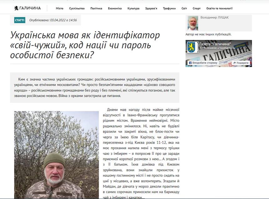 У інтернет-ресурсі газеті “Галичина” опублікована стаття професора Володимира Лущака “Українська мова як ідентифікатор «свій-чужий», код нації чи пароль особистої безпеки?”