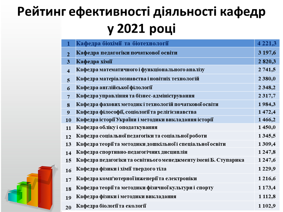 Проведено щорічне оцінювання ефективності роботи кафедр університету у 2021 року. Як і у минулому році, у 2021 році кафедра біохімії та біотехнології впевнено отримала перше місце (!). Це, насамперед, результат потужної наукової та міжнародної діяльності кафедри