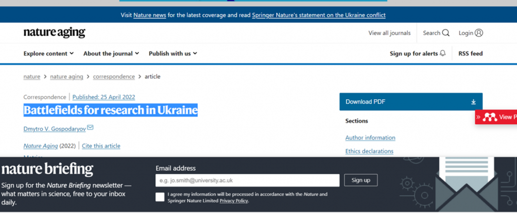 Працюємо на науково-інформаційному фронті – Letter to Editor in Nature Aging, доц. Дмитро Господарьов “Війна, яка розпочалась в Україні 24 лютого 2022 року, глибоко вплинула на наукові дослідження по всій країні”.