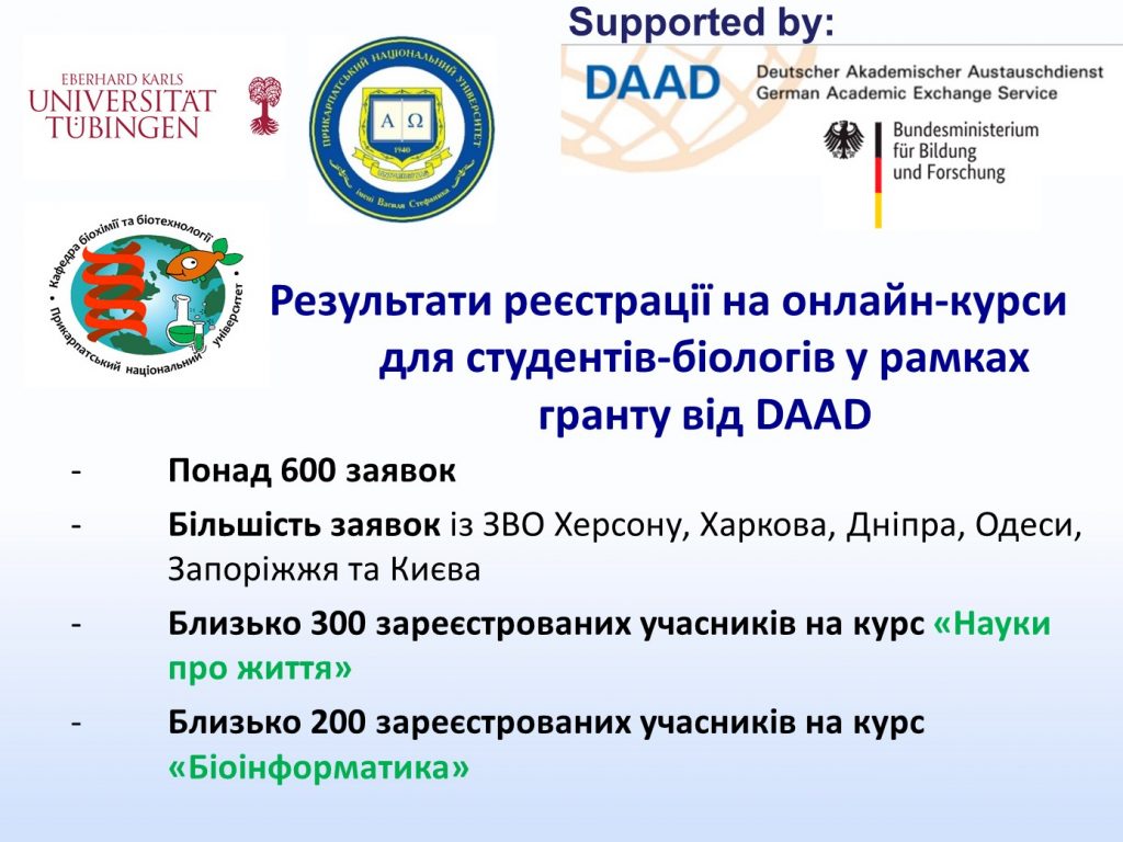 З ініціативи професорки Ольги Гаращук, директорки інституту фізіології університету м. Тюбінгену (Німеччина), та співучасті її багаторічного колеги професора Володимира Лущака, завідувача кафедри біохімії та біотехнології Прикарпатського національного університету імені Василя Стефаника, а також їхніх колег був розроблений проєкт підтримки українських студентів-біологів у період війни. Проєктом передбачено два інтенсивні онлайн-курси – Інтегрований курс ”Науки про життя” та “Біоінформатика”, які дозволять студентам як надолужити втрачені знання через перерване навчання, так і набути нових знань з відповідних дисциплін. Проєкт фінансово підтриманий Німецької Служби академічних обмінів (DAAD) у рамках програми «Ukraine digital: Ensuring academic success in times of crisis». Тривалість проєкту – вересень – грудень 2022 року.
