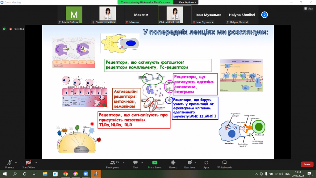 Сьогодні доцент кафедри біохімії та біотехнології Олександра Абрат провела відкриту онлайн-лекцію з молекулярної імунології для студентів 4-го курсу. Досить насичена інформативно та складна тема про антигенні детермінати і синтез антитіл. Лекторка у своїй лекції спиралась на результати останніх наукових досліджень та вдало використала ілюстративні схеми для пояснення складного матеріалу. Живий темп лекції та чіткі пояснення показали, що лекторка дуже добре володіє матеріалом. Загалом, лекція була проведена на високому науково-методичному рівні.
