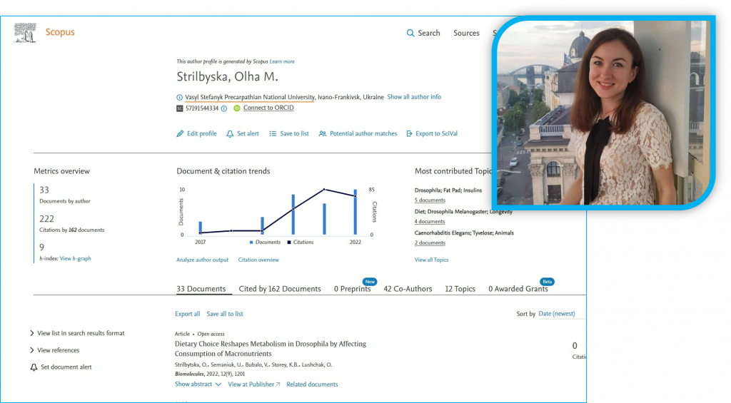 11 статей у наукових журналах, які індексуються у базі Scopus, та h-індекс – 9 – ось такий результат наукової роботи нашої молодої науковиці, кандидата біологічних наук Ольги Стрільбицької за неповний 2022 рік. Зазначимо, що Ольга перебуває у декретній відпустці, але це не стало перешкодою для активної наукової діяльності. Досягнення Ольги є яскравим підтвердженням приказки: коли любиш, те що робиш, час знайдеться.