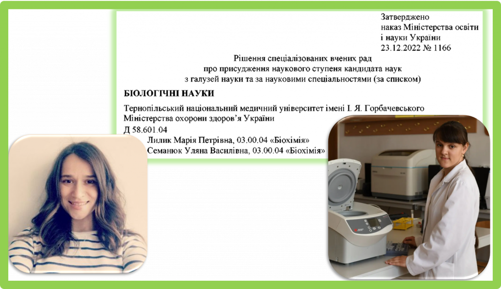 Ще одна приємна новина – нашим молодим співробітницям – Марії Лилик, завідувачу навчально-наукової лабораторії, та Уляні Семанюк, провідній фахівчині, присуджено ступінь кандидата біологічних наук зі спеціальності “Біохімія”