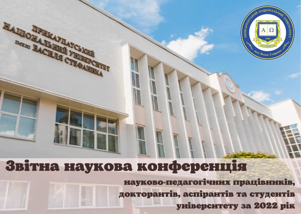 3 квітня 2023 року в змішаному режимі у Центрі інноваційних освітніх технологій «PNU EcoSystem» Прикарпатського національного університету імені Василя Стефаника відбудеться звітна наукова конференція науково-педагогічних працівників, докторантів, аспірантів та студентів університету за 2022 рік.