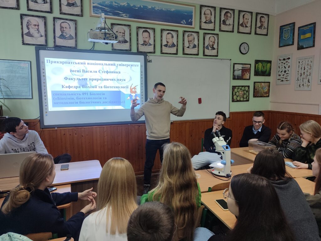 29 березня 2023 року в Івано-Франківському ліцеї імені Івана Пулюя (https://www.facebook.com/profile.php?id=100053119099217) наші співробітники провели профорієнтаційні заходи для ліцеїстів третіх курсів. Асистент кафедри Ігор Юркевич розповів учням про підходи до навчання «від науки». Учням представили наявне обладнання кафедри і можливості його застосування як в навчанні, так і в роботі за спеціальністю в природничій сфері. Обговорювали перспективи роботи науковця-дослідника в Україні та за кордоном, правила вступу до університету, академічну мобільність, різноманітні тренінги для учнів шкіл та ліцеїв на базі Кафедри біохімії та біотехнології, зокрема Осінню школу юного біохіміка. Провідний фахівець навчально-наукової лабораторії Кафедри біохімії та біотехнології Владислав Березовський організував та представив модельні організми (плодові мушки і миші), які використовуються в експериментальній біології. Даний захід спрямований допомогти та зрозуміти, що чекає на студентів та випускників кафедри в майбутньому житті і кар’єрі.