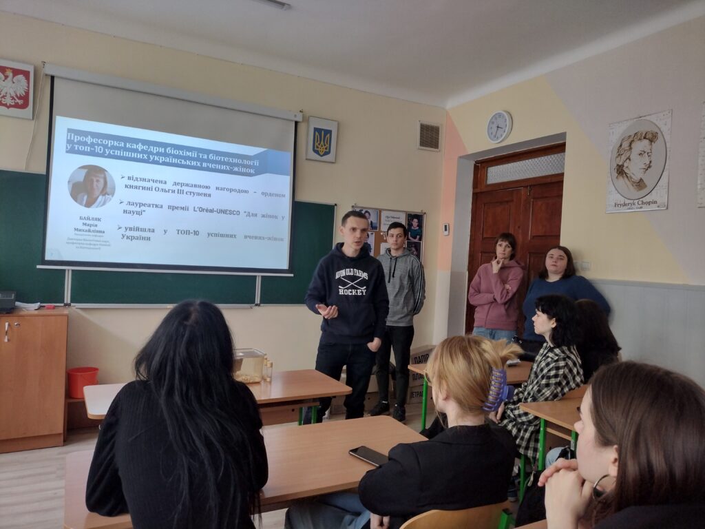 Асистент кафедри Ігор Юркевич розповів учням про підхід до навчання «від науки» – максимальне залучення студентів до наукових досліджень. Учням продемонстрували обладнання кафедри і можливості його застосування як в навчанні, так і в роботі за спеціальністю в природничій сфері. Під час зустрічі учні дізналися про умови вступу до університету, особливості організації освітнього процесу, студентське дозвілля, академічну мобільність та перспективи працевлаштування науковця-дослідника в Україні та за кордоном. Також їм розповіли про різноманітні тренінги на базі кафедри біохімії та біотехнології, зокрема Осінню школу юного біохіміка.