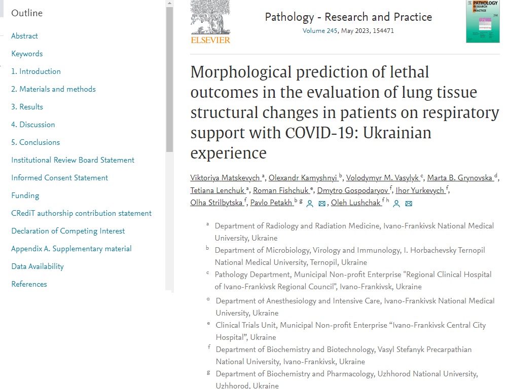 Вітаємо доцентів Олега Лущака та Дмитра Господарьова, а також викладача Ігора Юркевича та наукову співробітницю Ольгу Стрільбицьку із черговою публікацією в престижному журналі PathologyResearch and Practice. Стаття «Morphological prediction of lethal outcomes in the evaluation of lung tissue structural changes in patients on respiratory support with СOVID-19: Ukrainian experience» присвячена аналізу гістологічних, радіологічних ознак та супутніх захворювань у хворих, які померли від пневмоній, пов’язаних та не пов’язаних з COVID-19. В статті показано, які патології, гістологічні та радіологічні ознаки притаманні саме хворим з коронавірусною інфекцією, і які можуть бути факторами ризику для таких хворих.