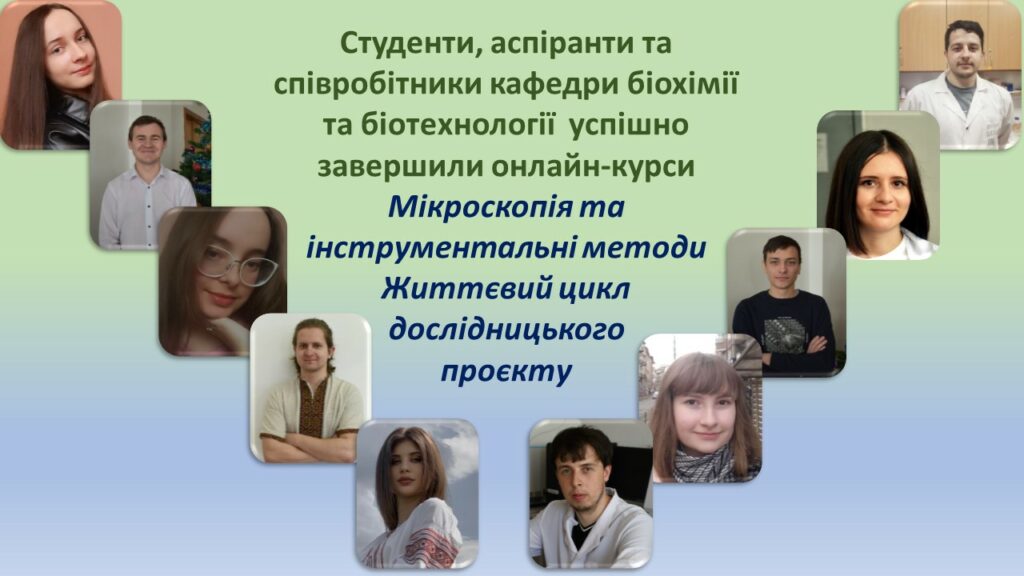Успішно завершили онлайн-курс «Життєвий цикл дослідницького проєкту»  студенти-біохіміки 2-4 курсів – Таїсія Кіндрат, Марія Рак, Вікторія Задарко та Надія Семків, курс «Мікроскопія та інструментальні методи в біології» аспіранти – Надія Стефанишин, Олег Дем’янчук, Віталій Балацький та Мар’ян Іваночко та співробітники – Віталій Деркачов та Владислав Березовський. 3 студентів та 4 аспірантів кафедри зможуть отримати стипендії (проєктом передбачено надання 61 стипендії у розмірі від 200 до 400 Євро, залежно від тривалості курсу). Необхідною умовою призначення стипендії є успішне засвоєння матеріалу курсу.