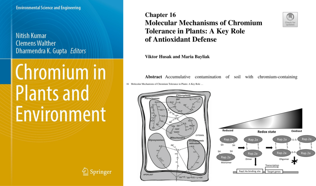Нещодавно у видавництві Springer вийшла книга «Chromium in Plants and Environment» (ed. Kumar, N., Walther, C., Gupta, D.K.). Нашими співробітниками, професоркою Марією Байляк та доцентом Віктором Гусаком підготовлено розділ книги «Molecular Mechanisms of Chromium Tolerance in Plants: A Key Role of Antioxidant Defense» В розділі розглянуто ключову роль антиоксидантного захисту рослин від дії іонів хрому та молекулярні механізми толерантності рослин до впливу цього іону. Також проводиться аналіз сучасних даних про участь редокс-регуляторів, зокрема Rap2.4a та NPR1, у регуляції адаптивної антиоксидантної відповіді рослин за дію іонів хрому.