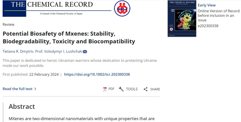 Вітаємо професора Володимира Лущака та провідну фахівчиню Тетяну Дмитрів з публікацією оглядової статті про безпеку максенів в журналі The Chemical Record (імпакт-фактор – 6,6; Q1 у галузі біохімії). Максени є карбідами та нітридами металів, здатними утворювати надтонкі шари. Максени були винайдені групою Юрія Гогоці – американського матеріалознавця українського походження. Спектр застосування і дослідження максенів постійно розширюється, а кількість досліджень щороку зростає. Ці нові матеріали є перспективними для виробництва надпотужних акумуляторів, батарей, композитних матеріалів, сенсорів, антен, тощо. В зв’язку з розширенням спектру застосування максенів, виникає питання про біобезпеку, біосумісність та токсичність цих сполук. Саме цим питанням присвячена оглядова стаття професора Лущака та провідної фахівчині Тетяни Дмитрів. Дослідження максенів є новим дослідницьким напрямком нашої кафедри, який ще чекає на свій повноцінний розвиток. Важливо також, що статтю присвячено українським воїнам, які боронять нашу країну від російських загарбників.