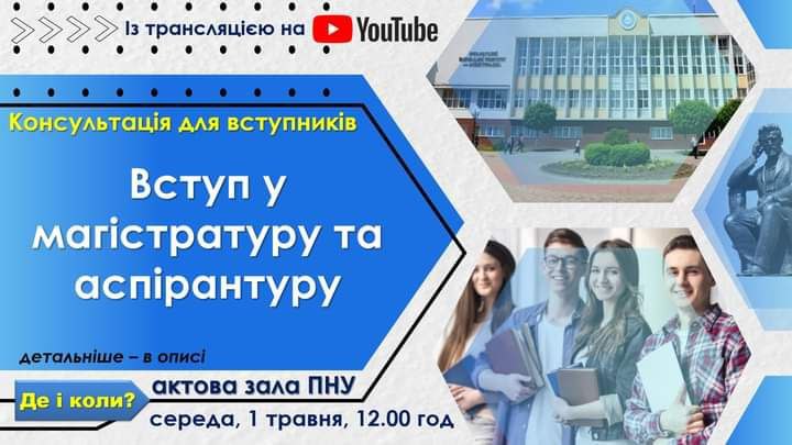 Прикарпатський національний університет імені Василя Стефаника запрошує випускників старших курсів, бакалаврів, осіб, які мають ступінь магістра та спеціаліста, на консультацію з приводу актуальних питань вступної кампанії 2024 року для бажаючих вступити на навчання на ОР магістр та ОНР доктор філософії.