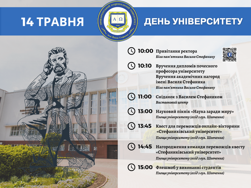14 травня запрошуємо студентів, аспірантів, докторантів, викладачів, ветеранів, працівників, випускників, гостей, друзів, партнерів та представників ЗМІ відзначити День університету та 153-ю річницю з Дня народження нашого патрона Василя Стефаника.