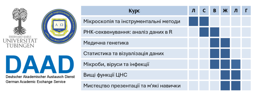 - Медична генетика (30 годин). Орієнтований на студентів біологічних та медичних спеціальностей. Викладач: Наталія Матійців (ЛНУ ім. Івана Франка). Цей курс є розвитком групи лекцій, які читалися в 2023 як частина курсу “біоінформатика”. Курс викладатиметься впродовж вересня-жовтня 2024. Форма реєстрації (відкрита до 20 серпня 2024).