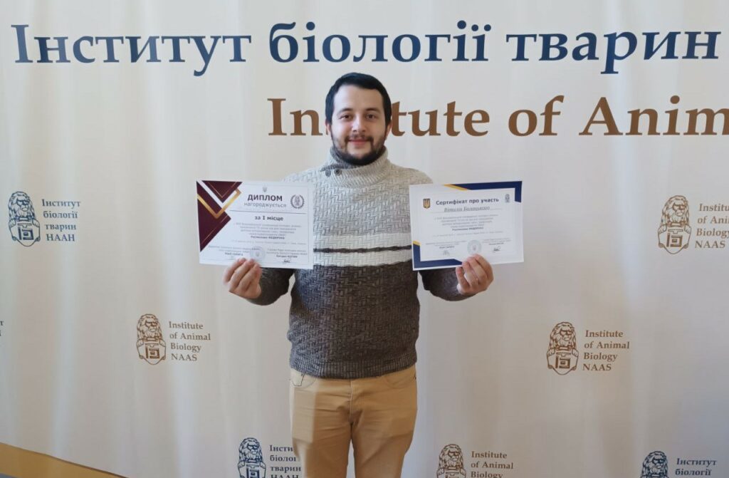 Раді вітати Віталія Балацького, якого відзначили дипломом І ступеня за кращу доповідь. Віталій виступив із доповіддю «Довготривалі метаболічні зміни в організмі мишей після впливу різних травматичних стресів»