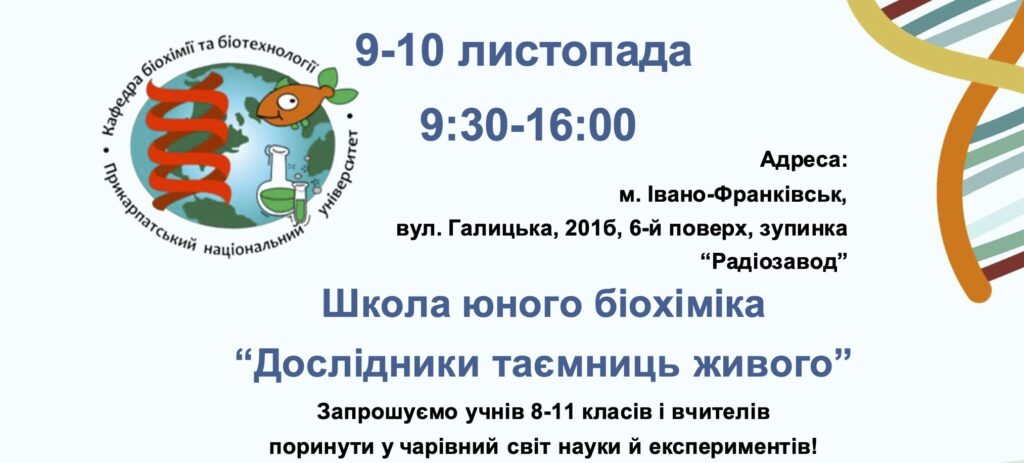 Запрошуємо учнів 8-11 класів взяти участь у традиційній Осінній школі юного біохіміка, яка відбудеться 9-10 листопада 2024 року в лабораторіях кафедри біохімії та біотехнології Факультету природничих наук Прикарпатського національного університету.