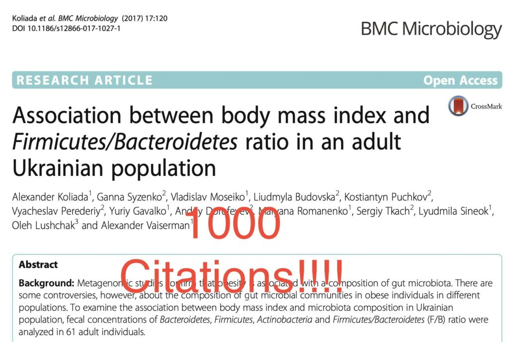 Дослідження, яке виявило зв’язок між індексом маси тіла (ІМТ) і співвідношенням Firmicutes/Bacteroidetes в кишковій мікробіоті українських дорослих, здобуло 1000 цитувань. У статті, команда дослідників проаналізувала, як змінюється склад мікробіоти залежно від ІМТ. Вони виявили, що зі збільшенням ІМТ у людей зростає рівень Firmicutes і знижується рівень Bacteroidetes. Це дослідження є важливим внеском у розуміння зв’язку між ожирінням та мікробіотою кишківника.