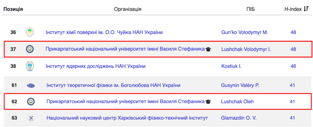 - Лущак Олег Володимирович — індекс Гірша 41, місце в рейтингу: 62