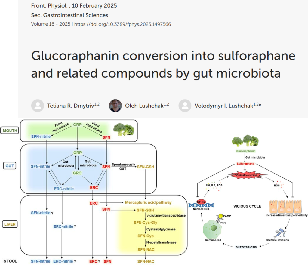 Нещодавно наші науковці опублікували оглядову статтю у журналі Frontiers in Physiology (Q2). У роботі під назвою “Перетворення глюкорафаніну на сульфорафан та споріднені сполуки мікробіотою кишківника” дослідники розглядають як глюкорафанін, що міститься в хрестоцвітих овочах, метаболізується кишковою мікробіотою у біологічно активні сполуки, такі як сульфорафан та еруцин. Ці сполуки є потужними активаторами сигнального шляху Nrf2, який координує адаптивну відповідь на оксидативний стрес.