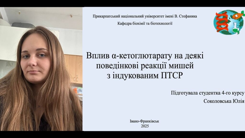 Студентка 4 курсу Юлія Соколовська – «Вплив α-кетоглютарату на деякі поведінкові реакції мишей з індукованим ПТСР».