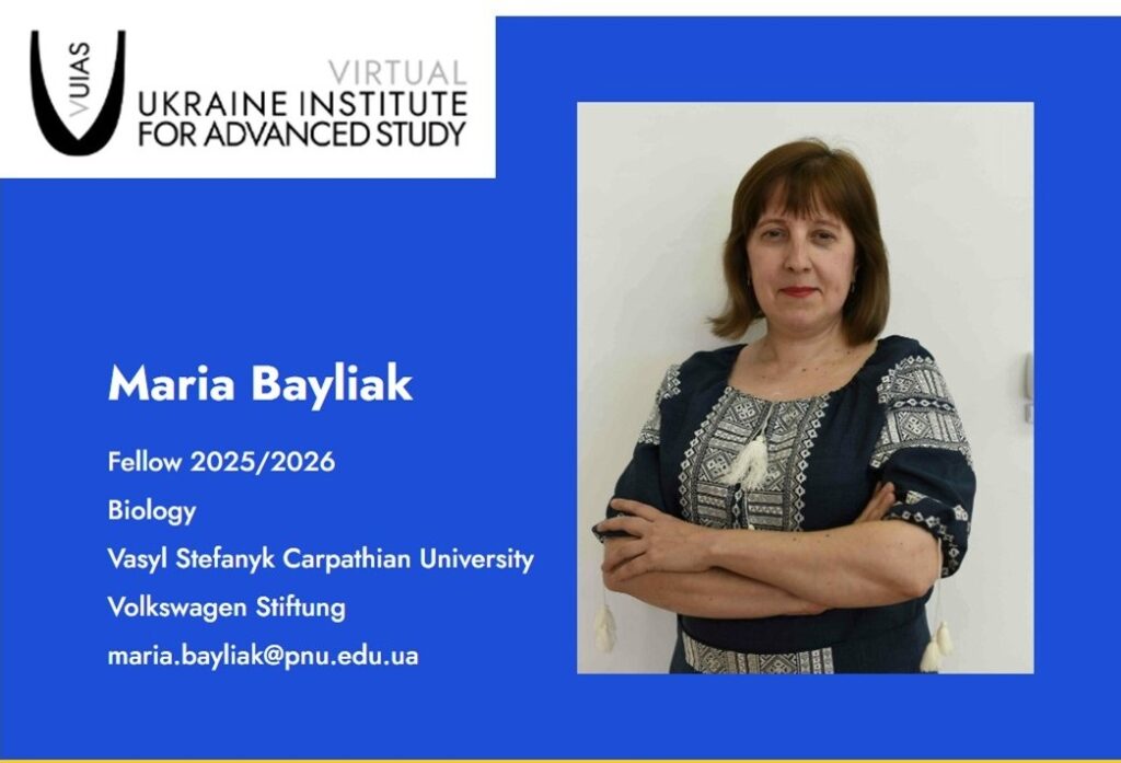З радістю повідомляємо, що завідувач кафедри біохімії та біотехнології, професор Марія Байляк, стала стипендіаткою програми VUIAS (Віртуального інституту перспективних досліджень України) на 2025-2026 академічний рік.