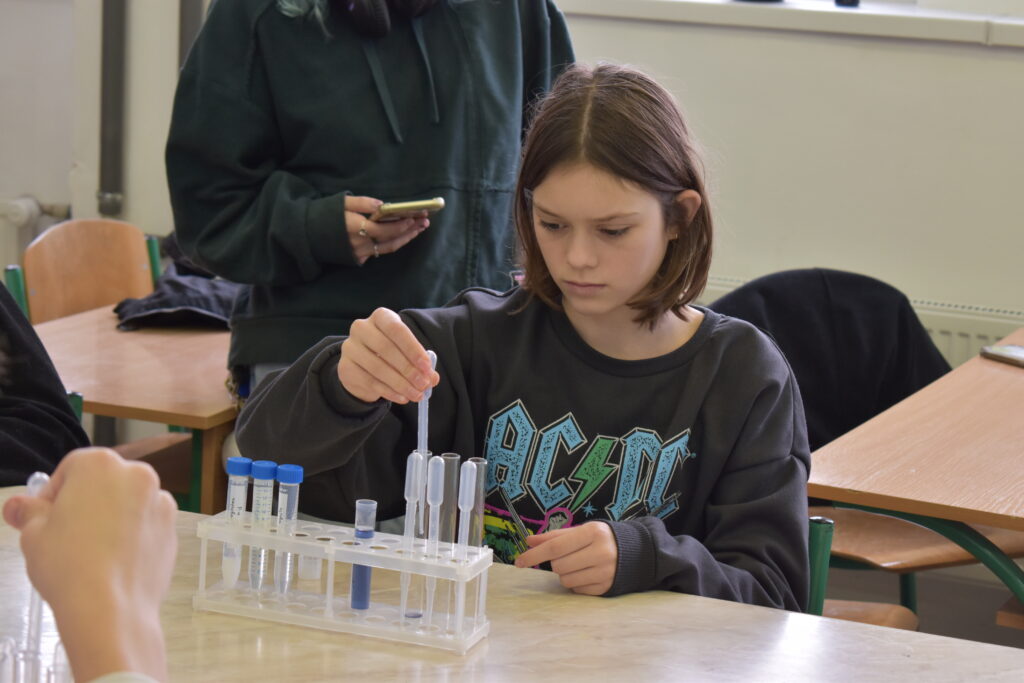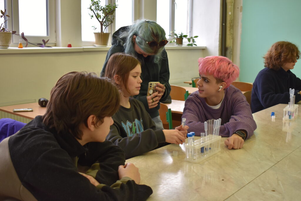 Особливе захоплення викликала практична частина візиту: учні спробували власноруч виконати кілька простих, але видовищних біохімічних дослідів. Зокрема, вони спостерігали хемілюмінесцентне світіння під час реакції люмінолу з окисником, бачили утворення характерного синього світіння, дослідили зміну кольору відвару синьої капусти під дією кислоти та лугу, а також стали свідками “дріжджового вулкана” — швидкого виділення піни внаслідок інтенсивного розкладу пероксиду водню ферментом каталазою, що міститься в дріжджах.