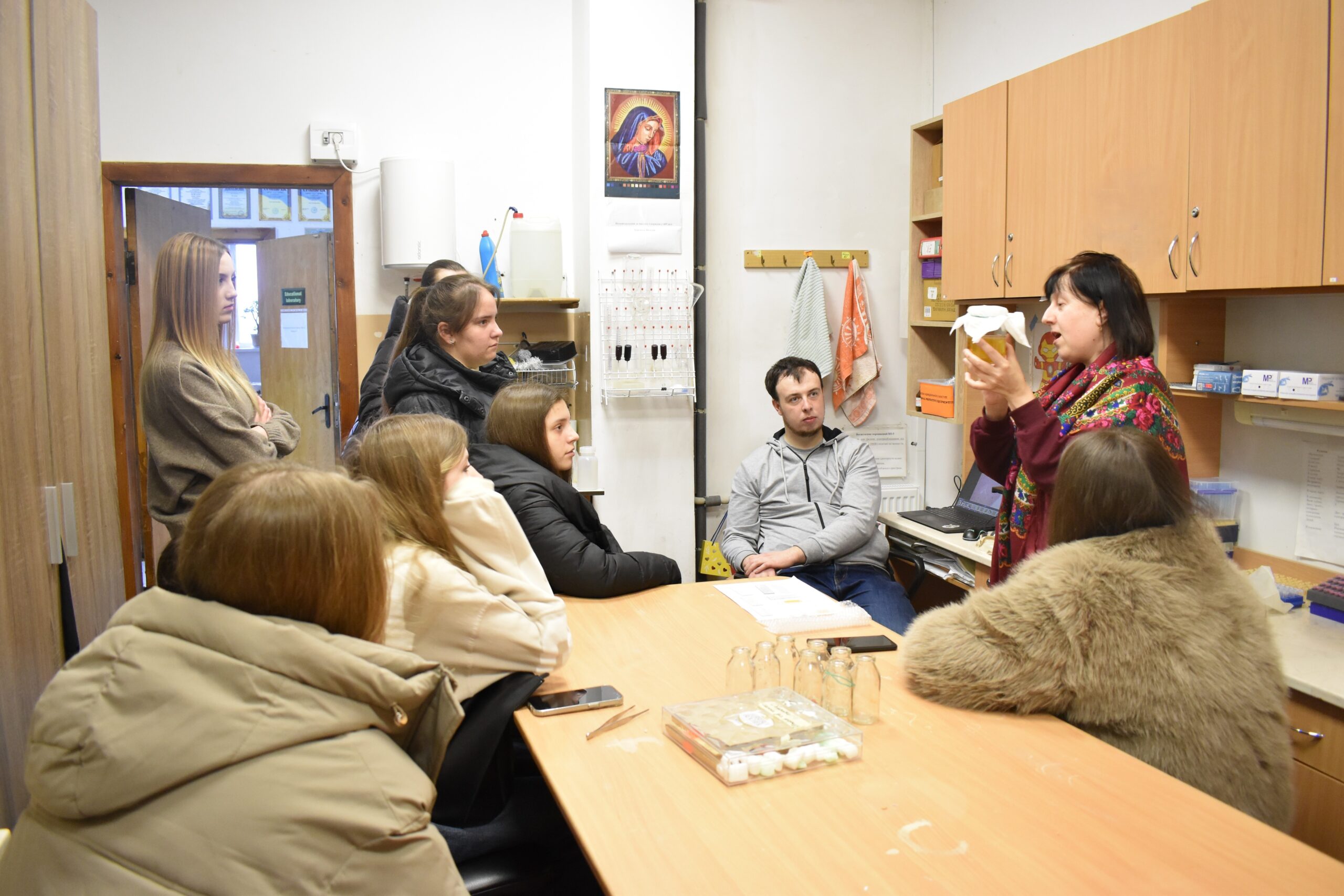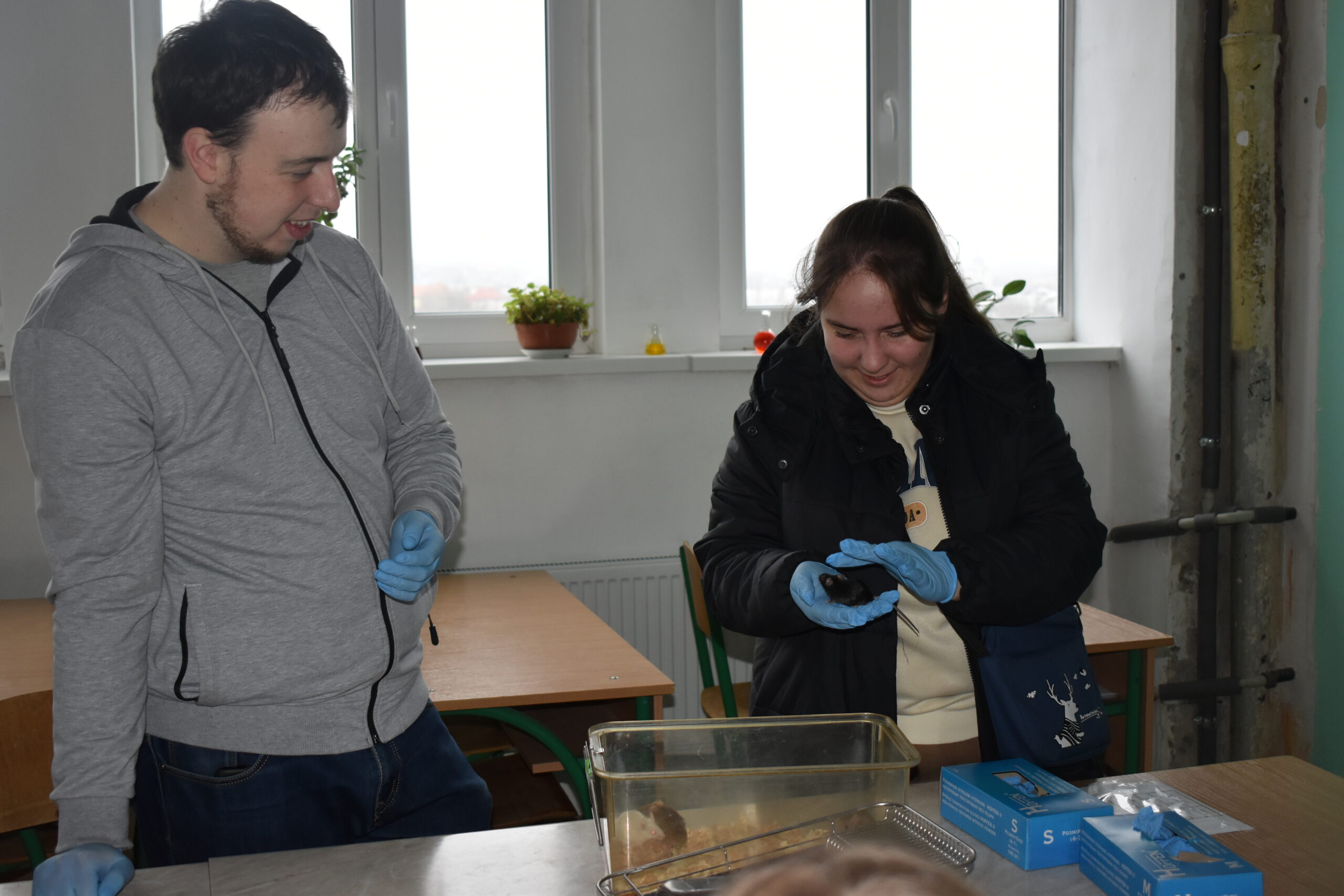 Під час екскурсії учням продемонстрували лабораторних мишей та розповіли про наукові дослідження, які проводять на цих модельних організмах як на нашій кафедрі, так і у світовій практиці. Також школярі ознайомилися з колекцією фіксованих препаратів і гістологічних зразків, отриманих на кафедрі, та дізналися про їхню роль і значення в сучасній медицині та біомедичних дослідженнях. Учні також мали приємну нагоду поспілкуватися із завідувачкою кафедри Марією Байляк. Вона розповіла про напрями досліджень, які проводять на мікроорганізмах, зокрема на чайному грибі (комбуча), та пояснила, яке значення такі дослідження мають для сучасної біомедицини — від вивчення властивостей симбіотичних культур до їхнього потенційного застосування у створенні нових біоматеріалів та пробіотичних продуктів. Учні також ознайомилися з іншим лабораторним організмом — плодовою мушкою. Їм розповіли про основні характеристики дрозофіл, чому цей вид вважається зручним для роботи в лабораторіях та які напрями сучасних досліджень часто базуються на використанні цього модельного організму.