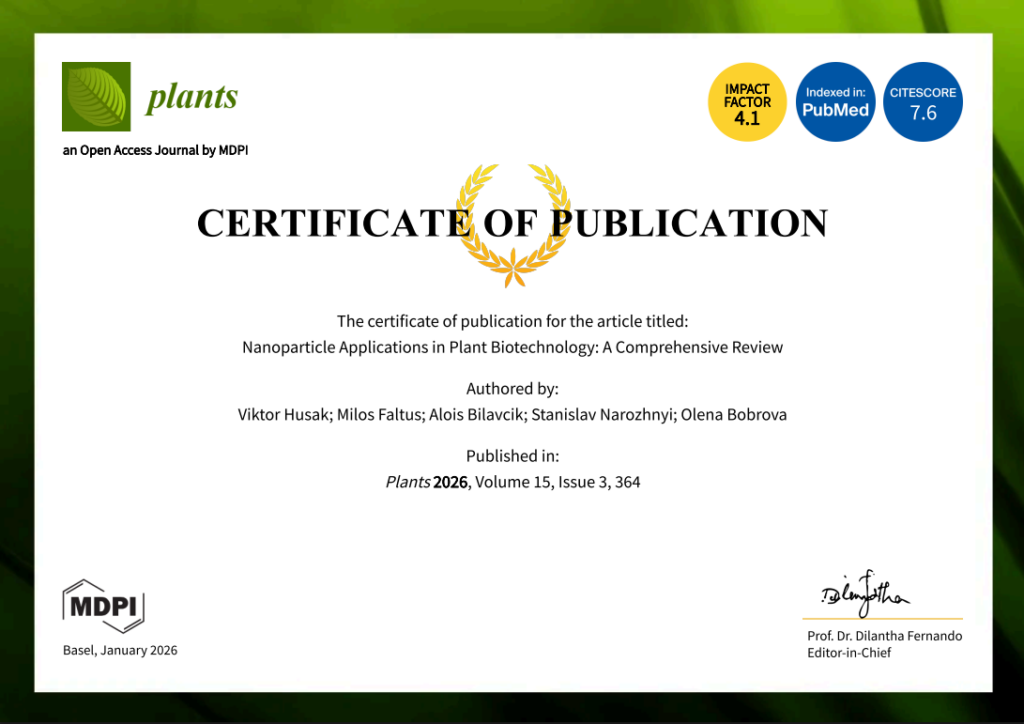 Колектив кафедри щиро вітає доцента Віктора Гусака з публікацією наукової оглядової статті “Nanoparticle Applications in Plant Biotechnology: A Comprehensive Review”у престижному міжнародному журналі Plants (MDPI) — одному з провідних фахових видань у галузі рослинної біології та біотехнології.