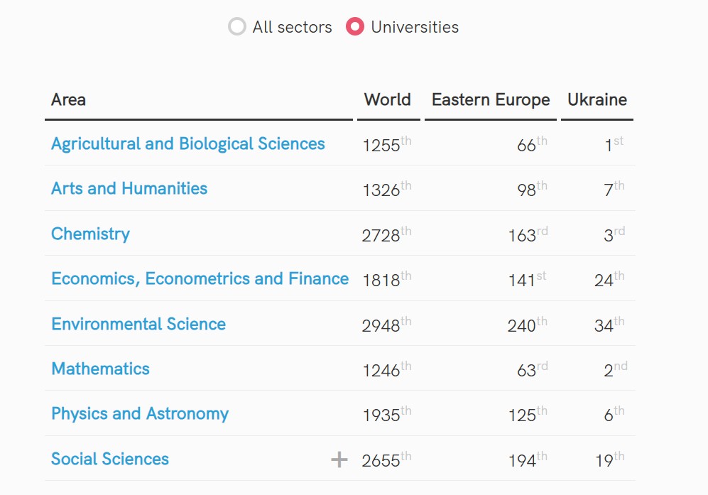 Особливо приємно, що за показником Ranks by Subject Areas ми посіли 🥇 перше місце в Україні в галузі “Biological and Agricultural Sciences” (Біологічні та сільськогосподарські науки).