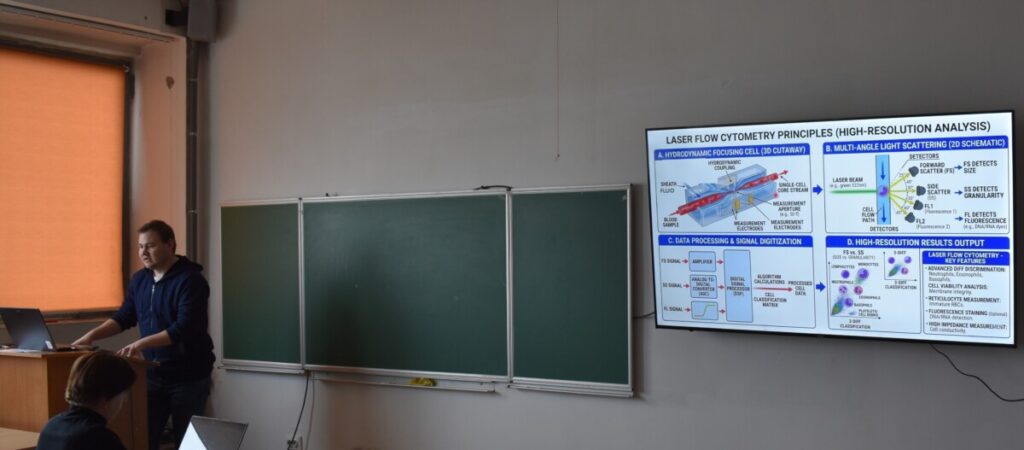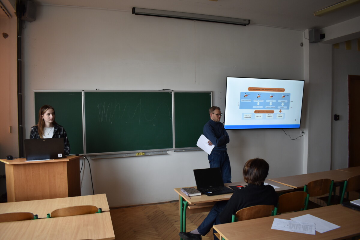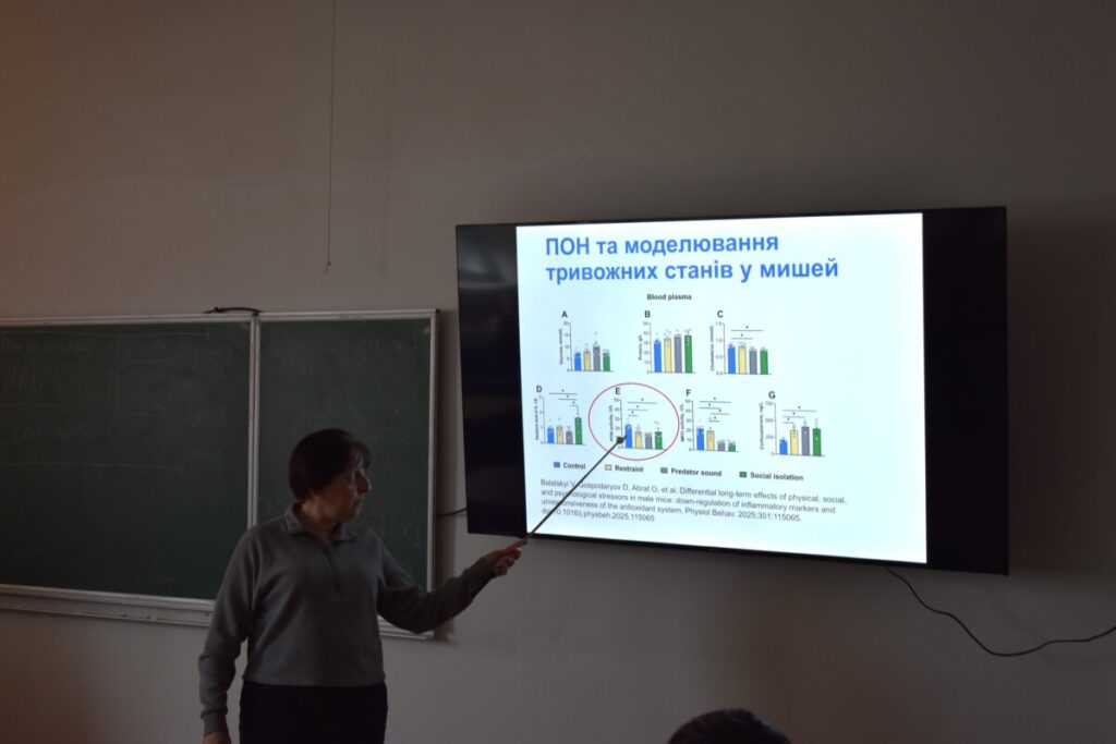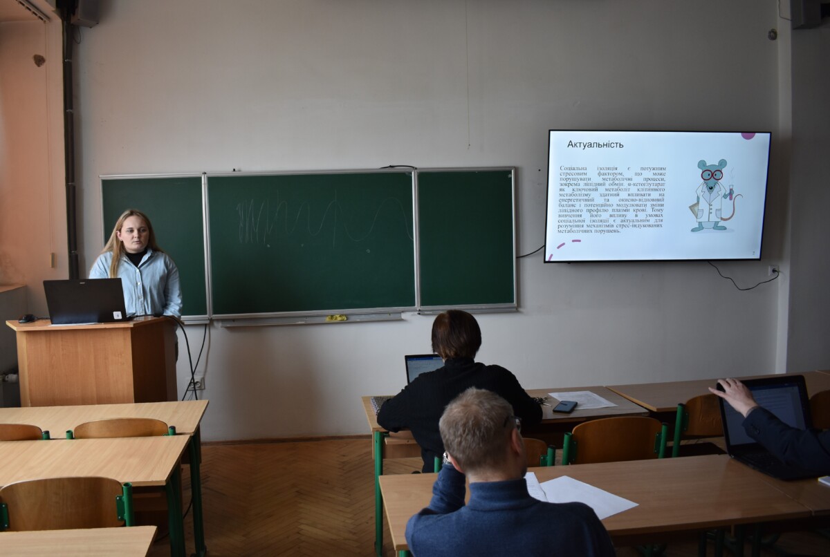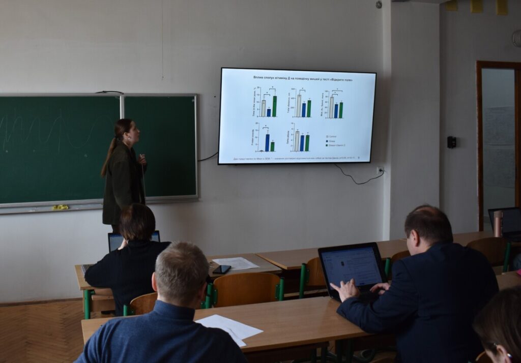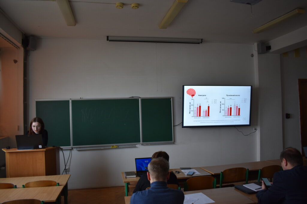 Не менш насиченою та цікавою була студентська звітно-наукова конференція, де студенти продемонстрували високий рівень підготовки та залучення до наукової роботи. Доповіді охоплювали актуальні питання нейробіології, біохімії та експериментальної медицини. Зокрема, було представлено дослідження ефективності інтраназального введення пептидів для доставки у мозок, впливу сполук вітаміну D на поведінку тварин за умов посттравматичного стресу, а також ролі α-кетоглутарату у регуляції поведінкових і метаболічних показників у мишей.