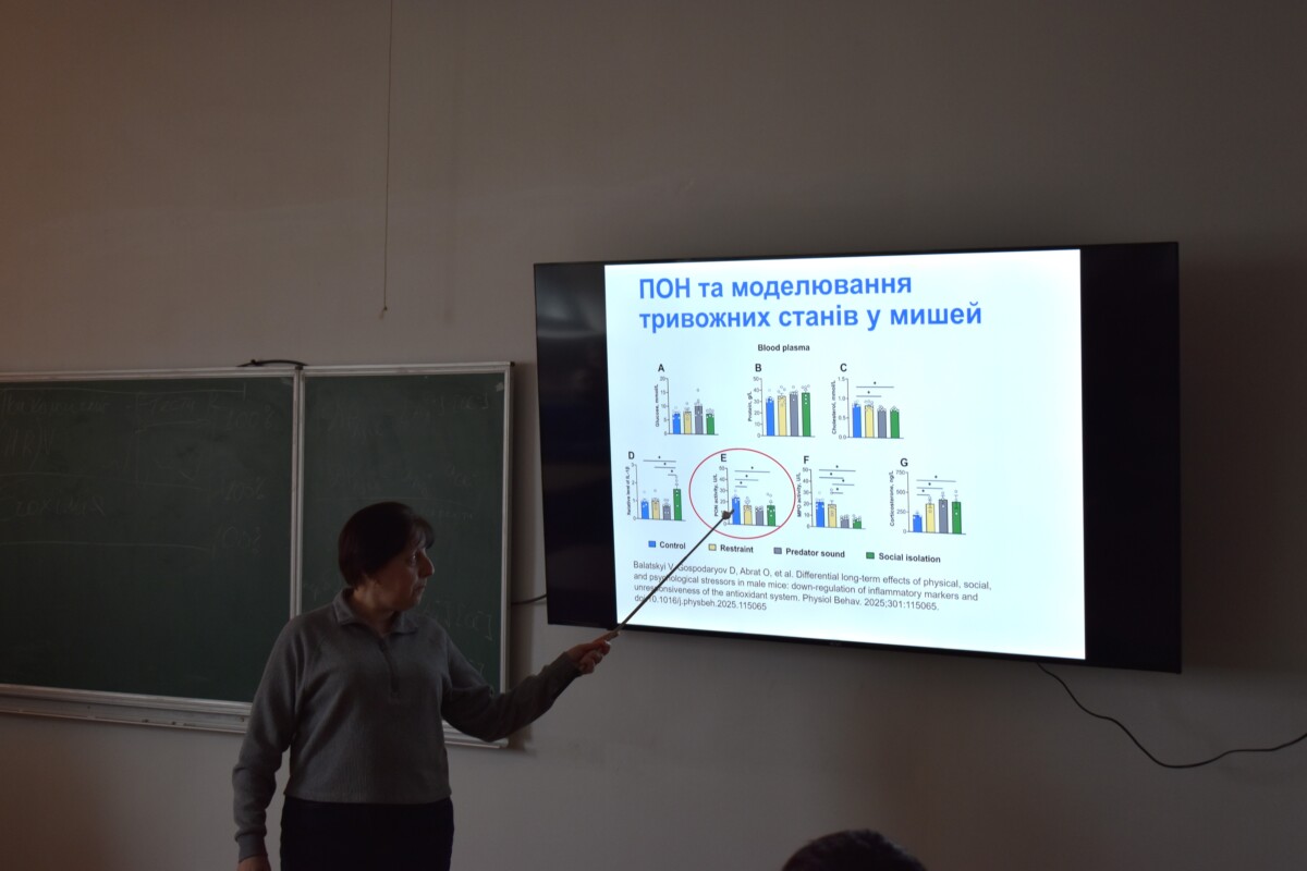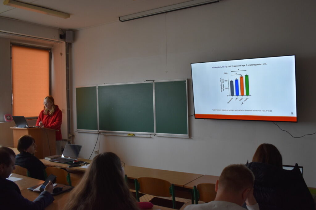 Також були представлені роботи, виконані на моделі Drosophila melanogaster, зокрема щодо впливу кадмієвої інтоксикації та корекції α-кетоглютаратом на показники оксидативного стресу, запасні речовини та стійкість до голодування.