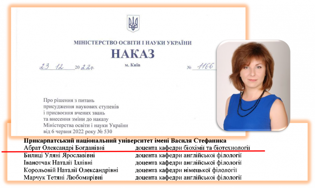 By the decision of the attestation board (order No. 1166 of December 23, 2023), the academic title of Associate Professor of the Department of Biochemistry and Biotechnology was awarded to our colleague – PhD of biological sciences Abrat Oleksandra Bohdanivna.