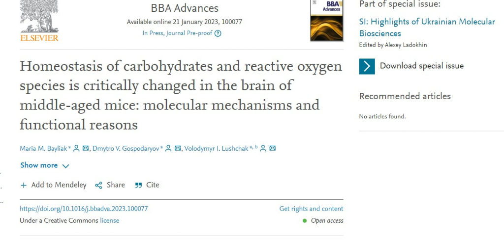 Congratulations to Professor Volodymyr Lushchak and Maria Bayliak, as well as Associate Professor Dmytro Gospodaryov on their first publication in 2023! The article “Homeostasis of carbohydrates and reactive oxygen species is critically changed in the brain of middle-aged mice: molecular mechanisms and functional reasons” https://www.sciencedirect.com/science/article/pii/S2667160323000066