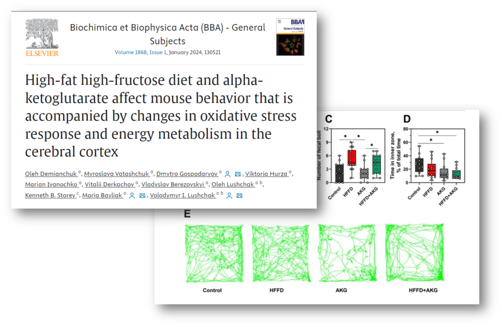 The study shows that a high-calorie diet with elevated fat and fructose content induces both anxious behavior and increased motor activity simultaneously. These physiological changes are accompanied by the development of oxidative stress in the brain and a restructuring of energy metabolism. The addition of α-ketoglutarate to the high-calorie diet attenuated the changes caused by this dietary pattern.