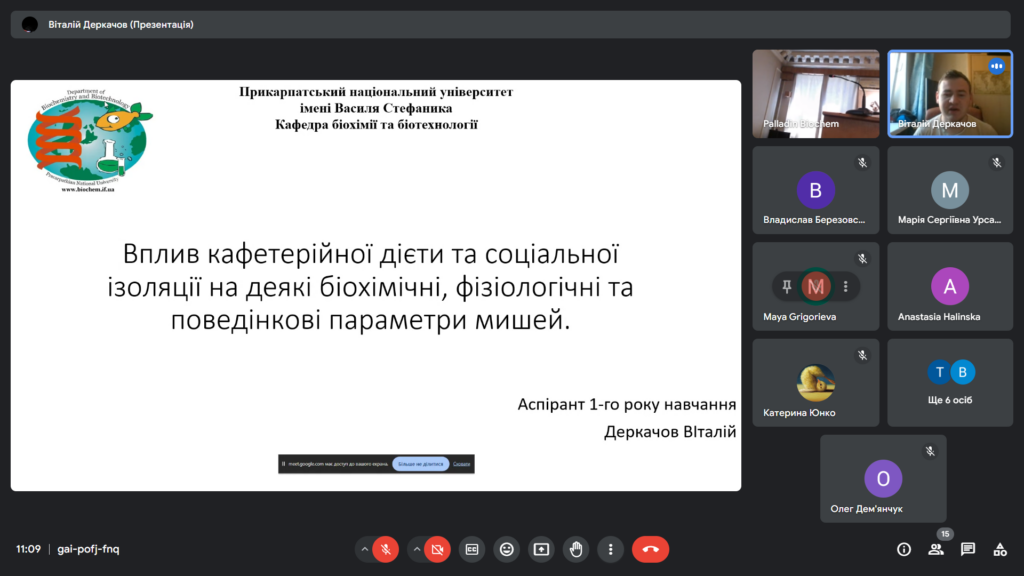 The Department of Biochemistry and Biotechnology congratulates three of our Ph.D. students who successfully presented their research papers at the online conference “Actual Problems of Biochemistry and Biotechnology”. The young scientists spoke in the Molecular Biology section and the Biochemistry section. Oleh Demianchuk made a presentation on “Alpha-ketoglutarate induces nuclear receptors rather than Nrf2 in the fruit fly Drosophila melanogaster“. Vitalii Derkachov presented his research on “The effect of cafeteria diet and social isolation on some biochemical, physiological and behavioural parameters of mice”. Vladyslav Berezovskyi reported on the topic “Carbohydrate metabolism of the short-lived line Drosophila melanogaster“. The postgraduate students’ presentations aroused considerable interest among the conference participants and received positive feedback from the scientific community.