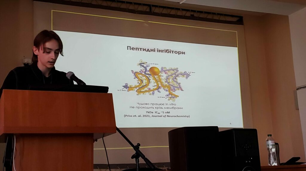 First-year master’s students Andrii Shturmak and Sviatoslav Kharuk attended the XVIII All-Ukrainian Conference of Young Scientists of the Institute of Molecular Biology and Genetics of the National Academy of Sciences of Ukraine, which was dedicated to the heroic work of Ukrainian scientists during the war. The conference was held on May 21–22 in Kyiv. The guys presented their work on the topic “Study of intranasal delivery of peptides to the brain of mice” in the section “Molecular Biology and Bioorganic Chemistry”. The report aroused interest, as this topic is now quite relevant and is actively developing in biomedicine. The students received positive feedback and high marks from the jury (6th place out of 33 reports!), which demonstrates the high level of research and professionalism of our young scientists.