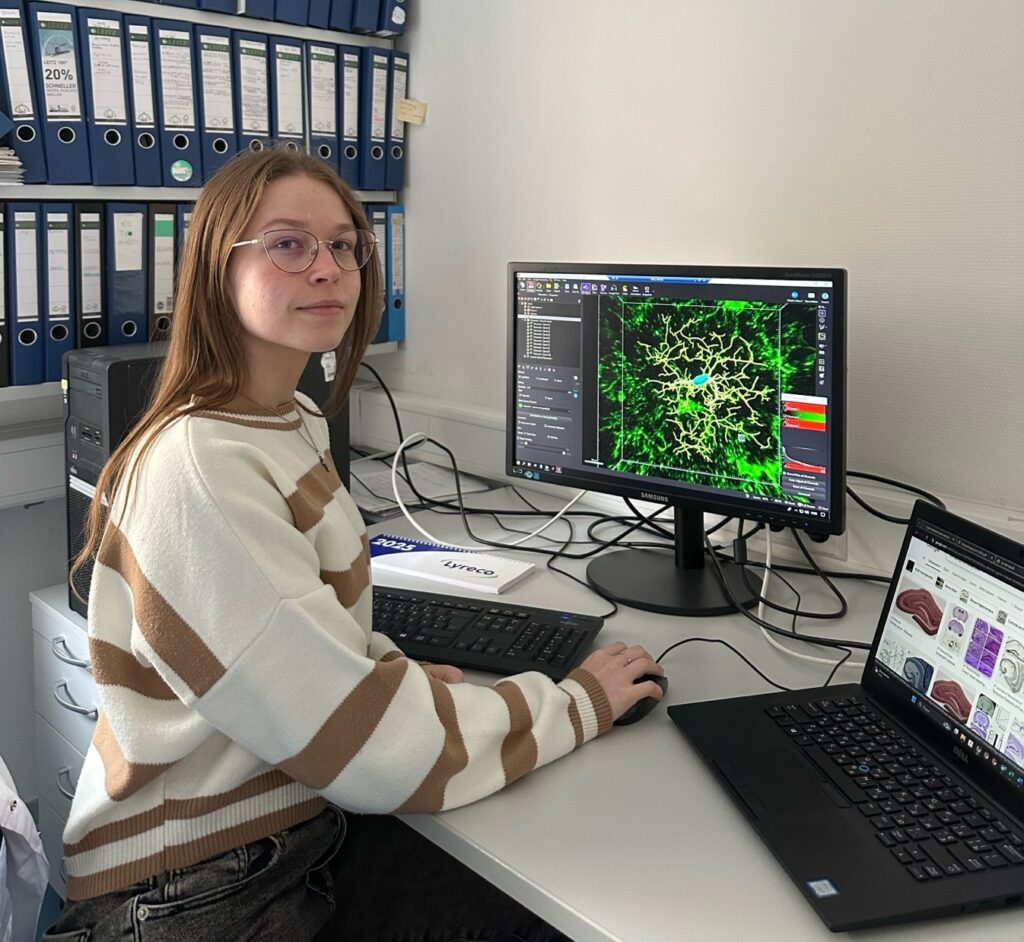 Khrystyna Fediv and Iryna Yatskiv, fourth-year students of the Department of Biochemistry and Biotechnology at the Faculty of Natural Sciences, are undergoing a three-month internship at the Institute of Physiology at the University of Tübingen. This is one of the oldest German universities known for its achievements in biology and medicine. The girls work in the neurophysiology laboratory, where they study the role of microglia in two different conditions: first, halogenated narcotics poisoning, which causes the development of pathogenic tumors and inflammation in the brain, and second, a gain-of-function (GoF) mutation in the KCNA2 gene, which encodes the Kv1.2 potassium channel. They master modern methods of fluorescence microscopy and digital image analysis. This area of research complements the work of the Department of Biochemistry and Biotechnology of our university, which studies the relationship between eating disorders and inflammatory processes in the brain.